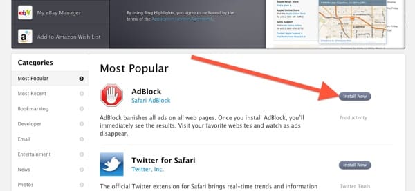 Adblock est le premier dans la liste des favoris. Cliquez sur le bouton “Install Now” et automatiquement l’installation d’Adblock commence : vous n’aurez pas besoin de redémarrer l’ordinateur, de fermer votre session ni de quitter Safari !